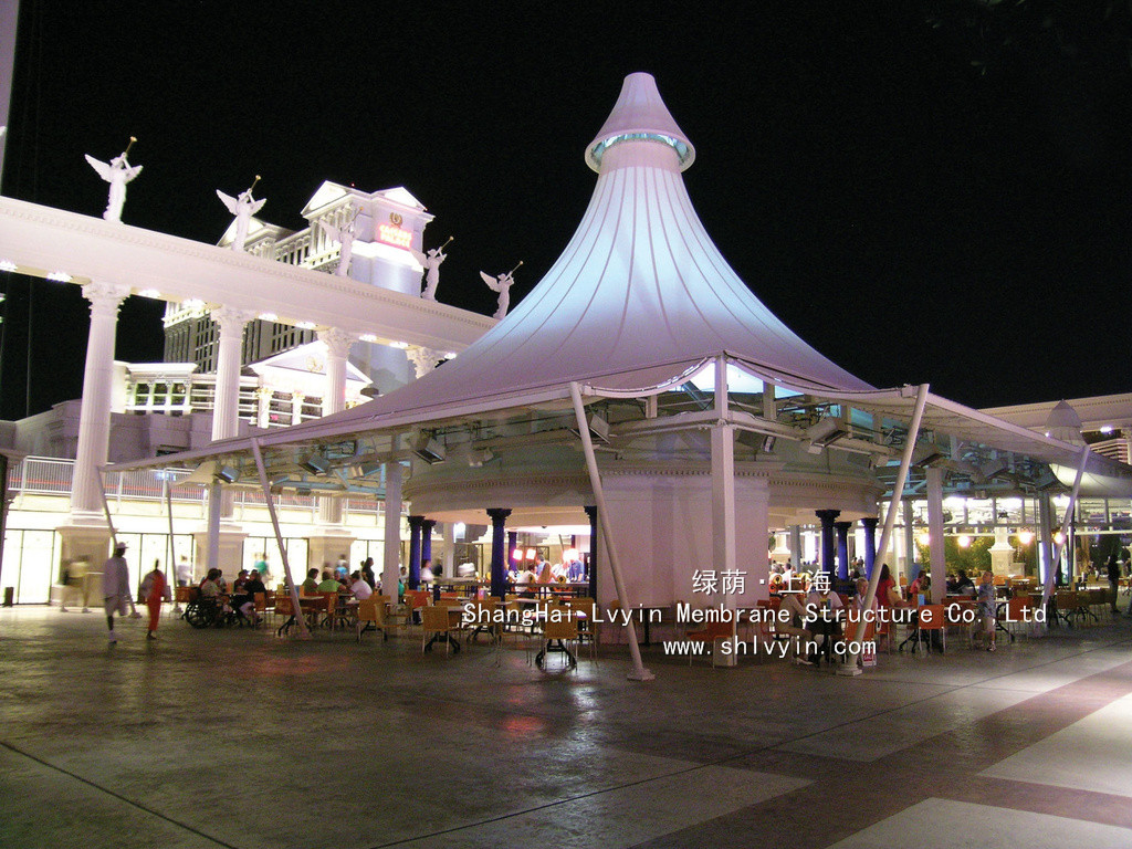 3. 永久性性膜材,使用年限30年以上。對(duì)太陽(yáng)能的反射率高,所以熱吸收量很少。即使在夏季炎熱的日光的照射下室內(nèi)也不會(huì)受太大影響。正是因?yàn)檫@種劃時(shí)代性的膜材料的發(fā)明,才使膜結(jié)構(gòu)建筑從人們想象中的帳篷或臨時(shí)性建筑發(fā)展成現(xiàn)代化的永久性建筑。