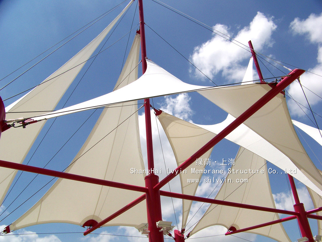 3. 永久性性膜材,使用年限30年以上。對太陽能的反射率高,所以熱吸收量很少。即使在夏季炎熱的日光的照射下室內也不會受太大影響。正是因為這種劃時代性的膜材料的發明, 才使膜結構建筑從人們想象中的帳篷或臨時性建筑發展成現代化的永久性建筑。